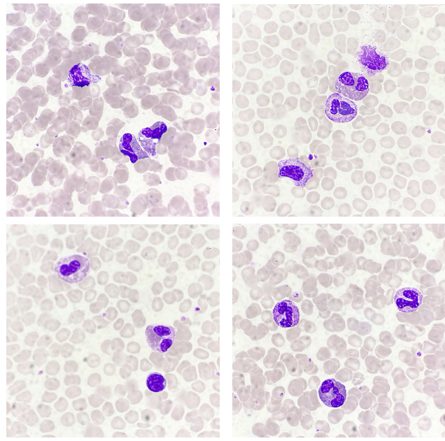 入院檢查雙耳前、耳后、頸前、頸后、腹股溝皆可扣及淋巴結(jié)腫大,質(zhì)軟,界清,易推動,部分融合。當遇到這樣一份血液細胞形態(tài)(骨髓+外周血)送檢單時,筆者首先想到的是—淋巴瘤。在鏡檢時,淋巴細胞易見,未見典型的淋巴瘤細胞,取而代之的是較多的嗜酸性粒細胞,見圖1~2: