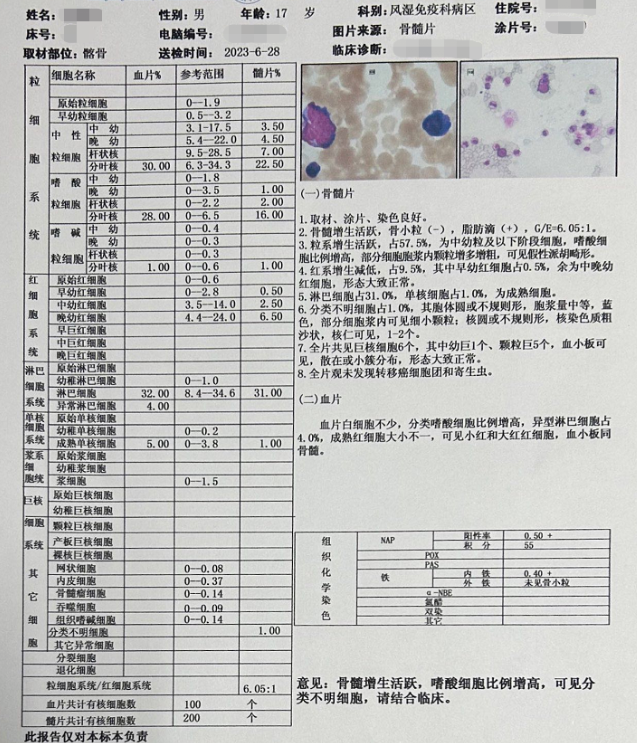 IGE:5919 IU/mL↑,血常規(guī)嗜酸性粒細胞:30.7%↑,骨髓活檢嗜酸性粒細胞易見,結(jié)合實驗檢查結(jié)果及患者臨床癥狀,出院診斷:木村病.