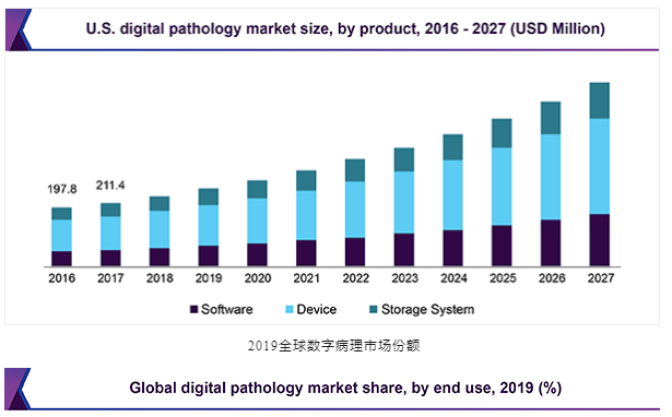 據(jù)2020年世界病理學(xué)大會報(bào)告,預(yù)計(jì)到2024年,病理學(xué)市場規(guī)模將從2019年的303億美元達(dá)到444億美元,從2019年到2024年的復(fù)合年增長率為6.1%。據(jù)GrandViewResearch預(yù)測,2019年全球數(shù)字病理學(xué)市場規(guī)模為7.676億美元,預(yù)計(jì)到2027復(fù)合年增長率為11.8%。根據(jù)最終用途,醫(yī)院在2019年占據(jù)了領(lǐng)先的市場份額。醫(yī)院采用數(shù)字掃描技術(shù)以加快診斷速度并提高患者依從性。就收入而言,2019年北美市場份額最大。