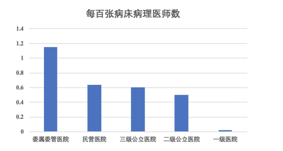 如上圖所示,其中委屬委管醫(yī)院每百張病床病理醫(yī)師數(shù)僅為1.15,三級公立醫(yī)院、二級公立醫(yī)院和民營醫(yī)院分別為0.60、0.50及0.64。根據(jù)最新發(fā)布的《2019年全國病理質(zhì)量報(bào)告》顯示,在不同級別的醫(yī)院中,全國平均每百張病床病理醫(yī)師數(shù)量為0.55,病理醫(yī)師數(shù)量奇缺的狀況沒有改善,各省、自治區(qū)、直轄市均未達(dá)到2009年《病理科建設(shè)與管理指南(試行)》(以下簡稱《指南》)的最低要求(每百張床1-2名病理醫(yī)師)。